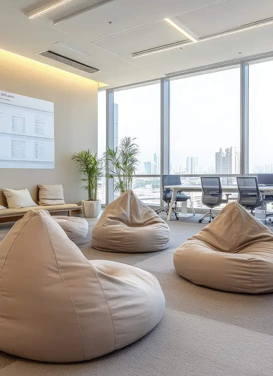Banquetas e puffs ajudam a transformar áreas subutilizadas em pontos de encontro, descanso e troca. Quando esses espaços são confortáveis e bem pensados, as pessoas se sentem mais acolhidas e a cultura da empresa ganha vida fora da mesa de trabalho.
